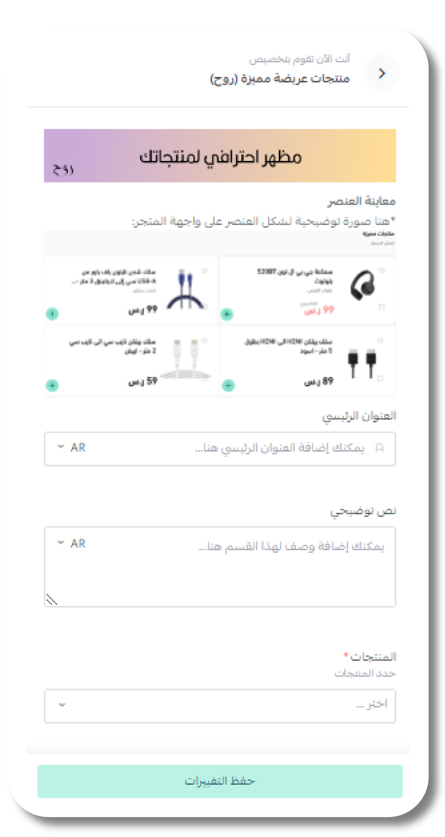 بعد اختيار العنصر يمكنك الان اضافة المنتجات المميزة لديك بشكل ملفت مع امكانية اضافة عنوان رئيسي ونص توضيحي.
